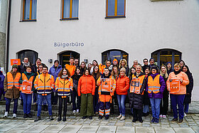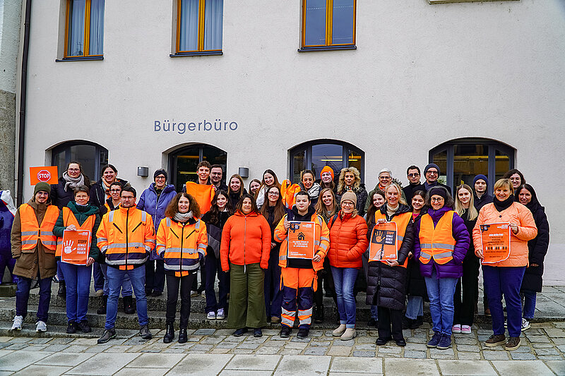 Zum Internationalen Tag zur Beseitigung von Gewalt gegen Frauen – dem weltweiten Orange Day – hat die Stadtverwaltung Freising ein sichtbares Zeichen der Solidarität gesetzt. Trotz nasskaltem Wetter versammelten sich am 25. November zahlreiche Mitarbeiterinnen und Mitarbeiter vor dem Bürgerbüro, gekleidet in leuchtendem Orange, um ein gemeinsames „Nein zu Gewalt an Frauen“ zu bekräftigen.