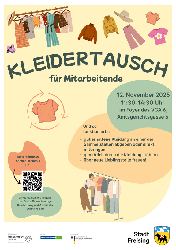 Die Stelle für nachhaltige Beschaffung lädt gemeinsam mit den Azubis alle Mitarbeitenden der Stadt Freising zum Kleidertausch ein. Am 12. November können saubere, gut erhaltene Kleidungsstücke getauscht werden. So können gemeinsam Ressourcen gespart und in entspannter Atmosphäre der Umwelt etwas Gutes getan werden.